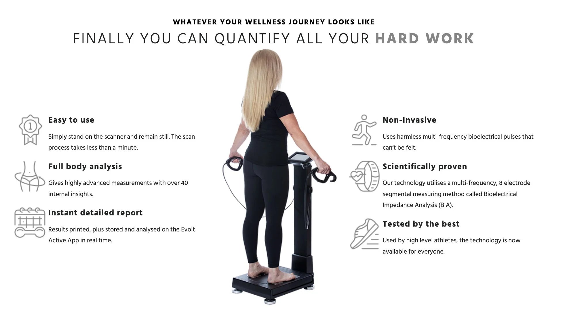 Our Evolt 360 Body Composition Scanner gives you a full snapshot of your health in under 60 seconds.